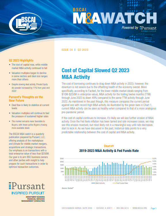 As part of our ongoing effort to enhance the value of your BSCAI membership, we are delighted to offer the BSCAI M&A Watch. This quarterly report is exclusively for BSCAI members and highlights mergers and acquisitions activity in the janitorial market. This member benefit will help keep you informed on deal flow and valuations. The reports are made possible through BSCAI's partnership with Pursant. Pursant helps business owners grow the value of their companies and maximize that value when they exit.